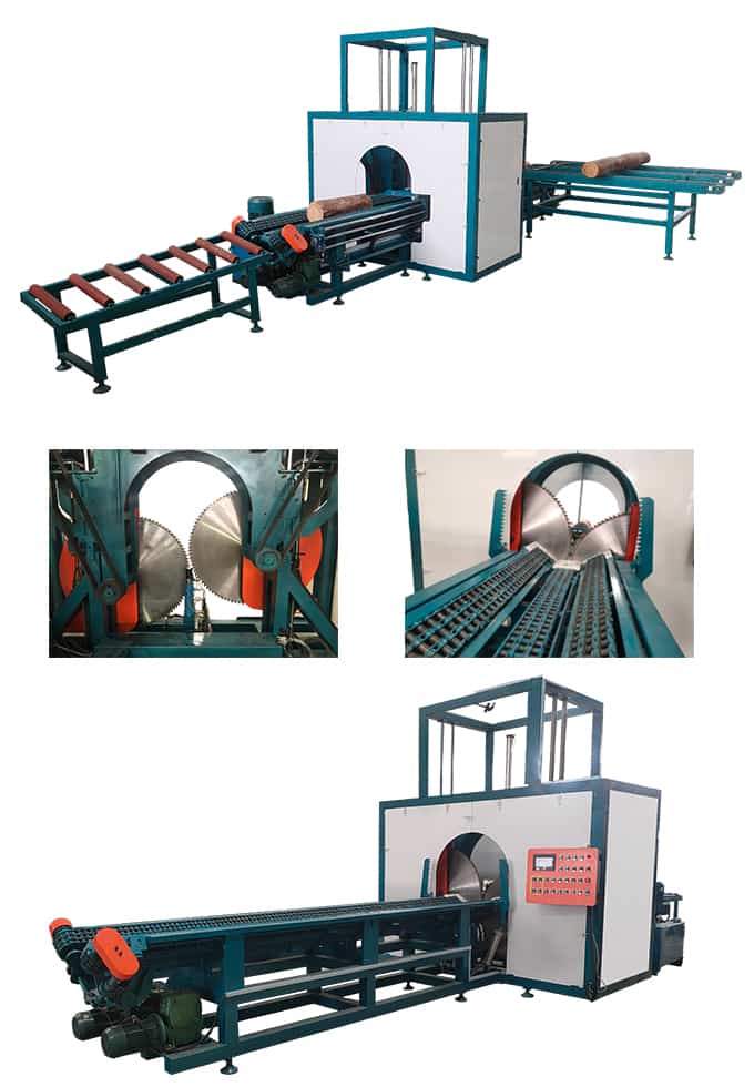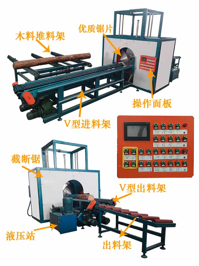 全自動數控截斷鋸是一種用于截斷圓木的專用機械,可取代傳統的斷木設備。本機是上下鋸設計,采用手自一體的液壓驅動,PLC數字控制系統,只需一名普通工人便可輕松操控,穩定性高,加工表面平整光潔,公差在2MM之內,截斷范圍可以隨意調節。加工長度和速度均可根據實際所需規格隨意調節,效率高,是傳統截斷機的2-5倍。鋸片配進口合金鋸片,使用壽命長.適用于原生木材,板材板方的切斷加工.本設備采用輸送臺自動進料,自動感應壓料,自動截斷,輸送臺自動出料等先進裝備,具有操作簡單,安全,效率快,切斷長短可隨意設定,省時省工,大大減輕操作者勞動強度等優點.