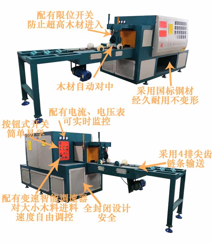 送 料:采用四排尖齒鏈條輸送,機上配有變頻智能調速器,可以對大小木料的進料速度實行自由調速。原木可以實現(xiàn)自動分中,機上還配有限位開關,防止超去規(guī)格木料進入,防止卡木避免對機器造成損壞。