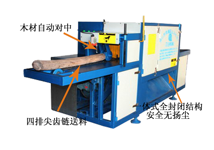 送 料:采用四排尖齒鏈條輸送,機(jī)上配有變頻智能調(diào)速器,可以對大小木料的進(jìn)料速度實(shí)行自由調(diào)速。原木可以實(shí)現(xiàn)自動分中,機(jī)上還配有限位開關(guān),防止超去規(guī)格木料進(jìn)入,防止卡木避免對機(jī)器造成損壞。