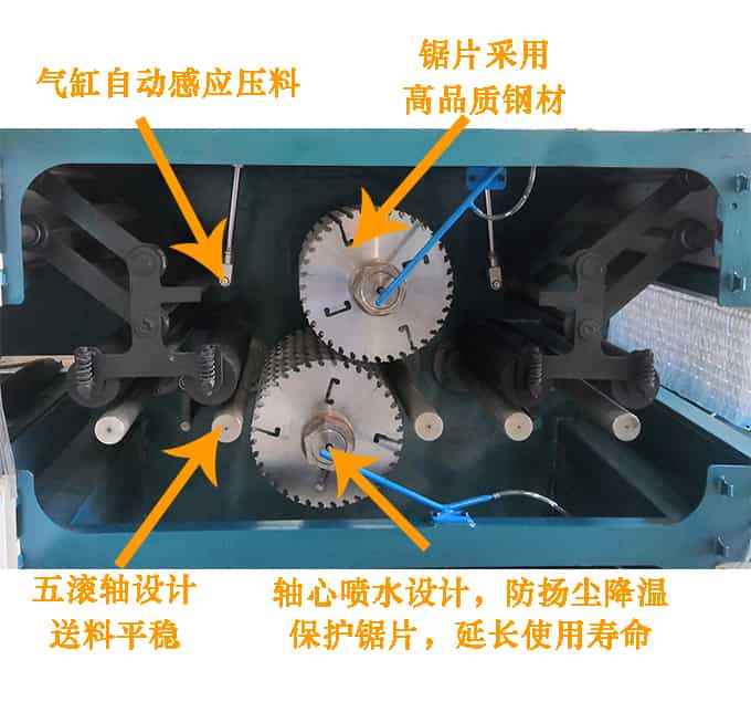 5.采用上下軸鋸設(shè)計,具有鋸片直徑小,鋸路小省料的優(yōu)點。上下鋸設(shè)計的鋸片鋸路是正常單軸鋸片鋸路的50%。加工同樣高度的木料其鋸路僅為普通單據(jù)軸的1/2。鋸切面光滑平整可以代替刨。節(jié)能降耗一次多片加工。送料速度高,大大提高加工效率,上料快,操作簡單,維護(hù)保養(yǎng)簡單,上下輥主彈簧壓力,送料平穩(wěn),增加鋸片的使用壽命。