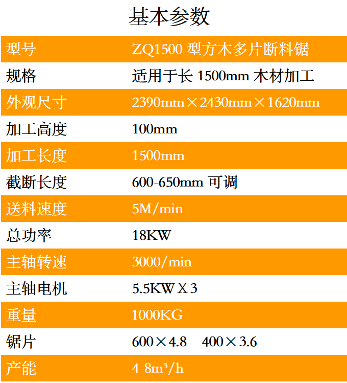方木多片斷料鋸可加工木材長度1500mm,高100mm,截斷尺寸600mm-650mm之間可調(diào),送料速度5M/min,機身采用國標鋼材、結(jié)構(gòu)緊湊、操作簡單、鋸面光滑、誤差小、效率高、故障率低。
