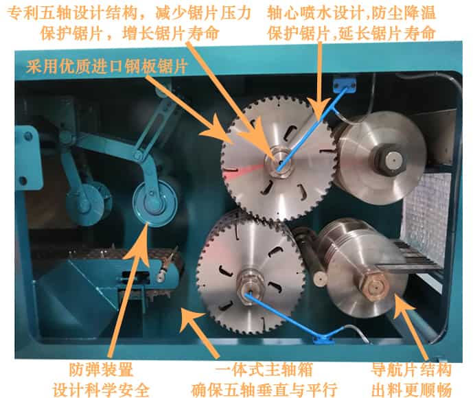 ZQ350型全自動原木多片鋸生產線是針對原木鋸切而設計的專用機床,其主要特點與性能:帶自動進料架、自動出料架、自動翻料架,可自動進料、自動對中、自動出料、自動翻料,極大提高效率降低人力成本。采用五軸結構設計-前鋸后導航確保木板的精確度,無論木板長短均可保證鋸切木材尺寸公差在0.2mm-0.5mm之內,尺寸標準偏差小,節約木料,上下鋸軸,鋸片采用進口帶刮刀鋸片,鋸切表面光滑,無需再刨,保證不燒鋸片。采用自動分中裝置,提高木材的利用率;上壓輥主動增加壓力,送料平穩;國內首創,軸心噴水冷卻鋸片,去脂降溫,增強鋸片的使用壽命。一次多片,大大提高工效;